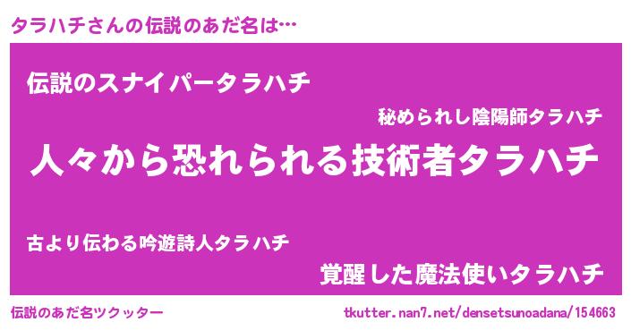 | ヒーロー風カッコイイあだ名 | 『正義の使者タラハチ』『暗黒騎士タラ』 |