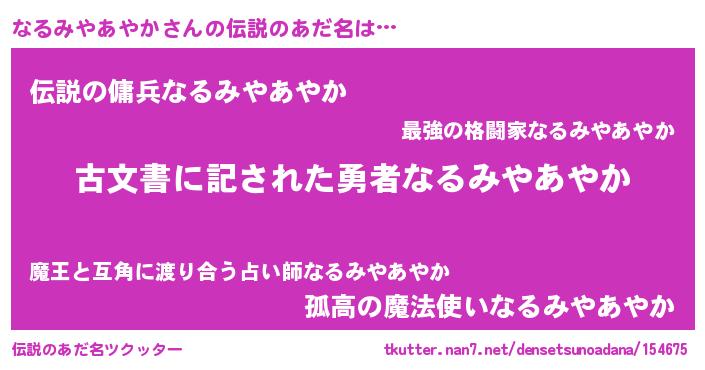 | ヒーロー風カッコイイあだ名 | 『ネオナルミヤアヤカ』『仮面ナルダー』 |