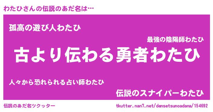 | ヒーロー風カッコイイあだ名 | 『ネオワタヒ』『銀牙騎士ワタ』 |
