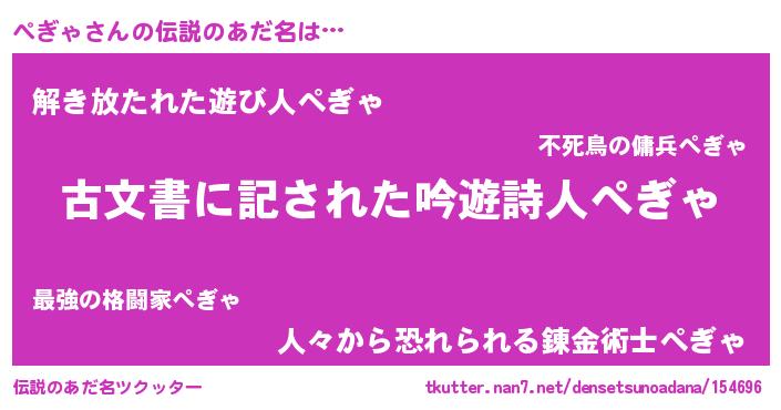 | 胡散臭い通販商品みたいなあだ名 | 『あなたにだけ特別に提供する100年もののヴィンテージワイン…その名も「ぺぎゃ」』 |