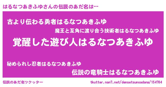 | ヒーロー風カッコイイあだ名 | 『炎刃騎士ハル』『ネオハルナツアキフユ』 |