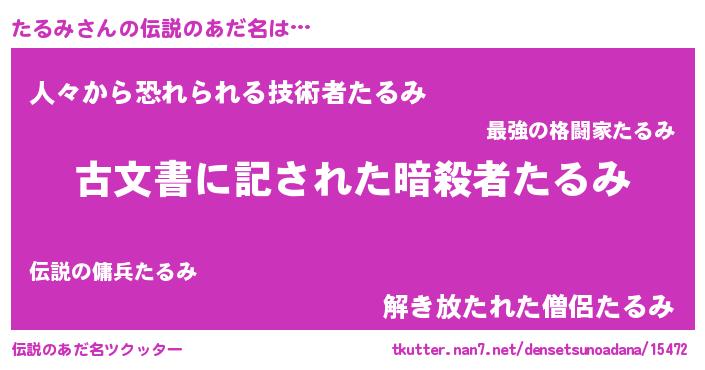 | 男性向けラノベタイトル風あだ名 | 『たるみ~年齢イコール彼女いない歴の魔法使い~』 |
