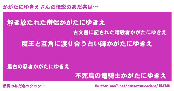 | 男性向けラノベタイトル風あだ名 | 『かがたにゆきえに滅ぼされるだけの簡単なお仕事です』 |