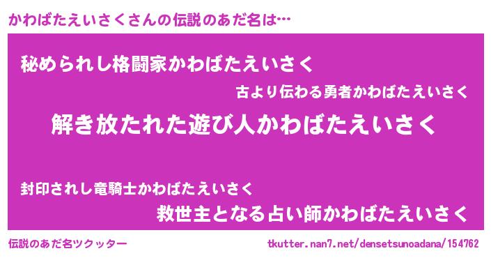 | ヒーロー風カッコイイあだ名 | 『銀牙騎士カワ』『ネオカワバタエイサク』 |