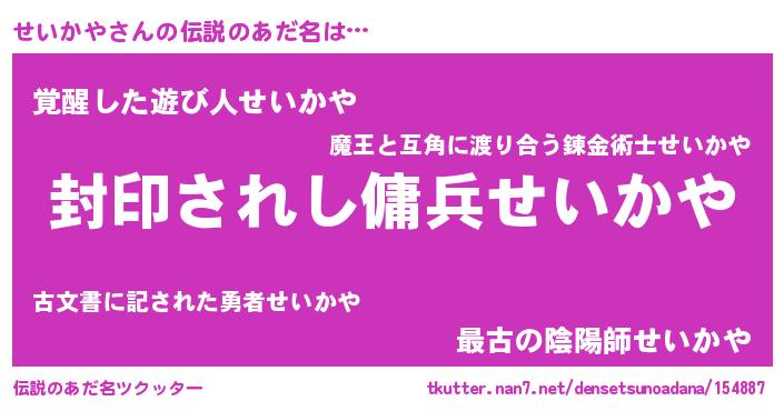 | 男性向けラノベタイトル風あだ名 | 『この素晴らしい世界にせいかやを!』 |