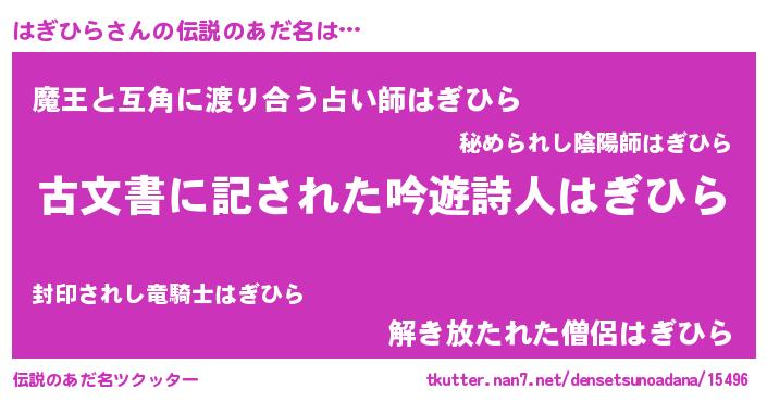 | 意味不明あだ名 | 『ヨモギ科はぎひら属』『自称はぎひら』 |