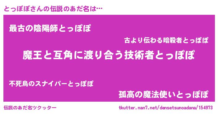 | 男性向けラノベタイトル風あだ名 | 『とっぽぽに滅ぼされるだけの簡単なお仕事です』 |