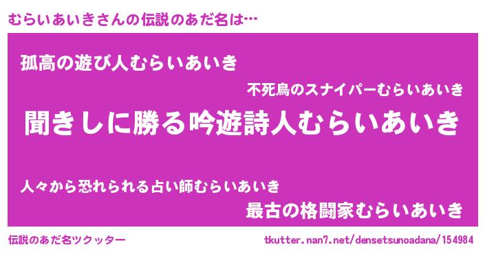 | ヘコむあだ名 | 『むらいあいき(小並感)』『むらっちょ』 |