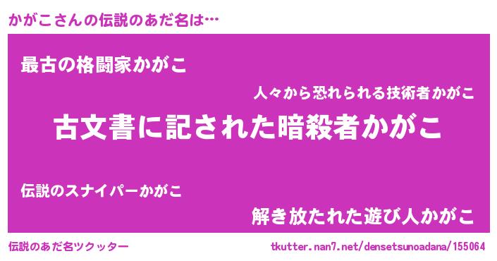 | ヒーロー風カッコイイあだ名 | 『ネオカガコ』『ウルトラかがこマン』 |