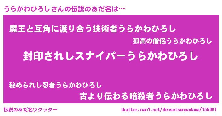 | 男性向けラノベタイトル風あだ名 | 『うらかわひろしに滅ぼされるだけの簡単なお仕事です』 |