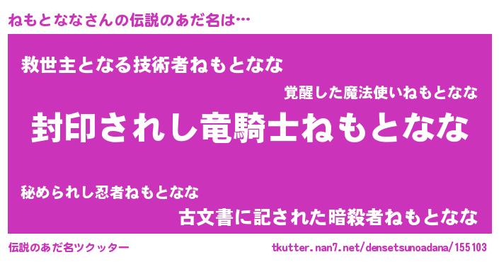 | 男性向けラノベタイトル風あだ名 | 『この素晴らしい世界にねもとななを!』 |