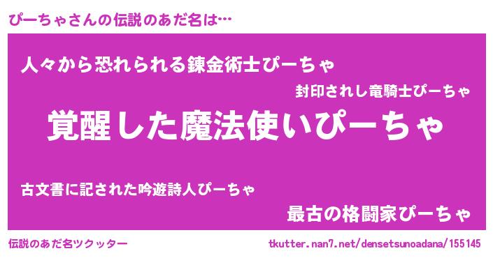 | 女子向けラノベタイトル風あだ名 | 『ぴーちゃ様がみてる』 |
