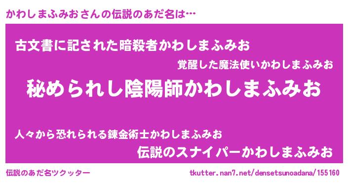| ファンタジー風あだ名 | 『エターナルカワシマフミオー』 |