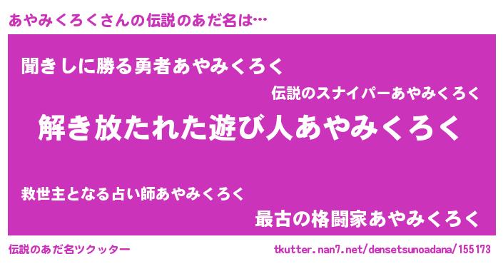 | 意味不明あだ名 | 『住所不定無職あやみくろく(71歳)』 |