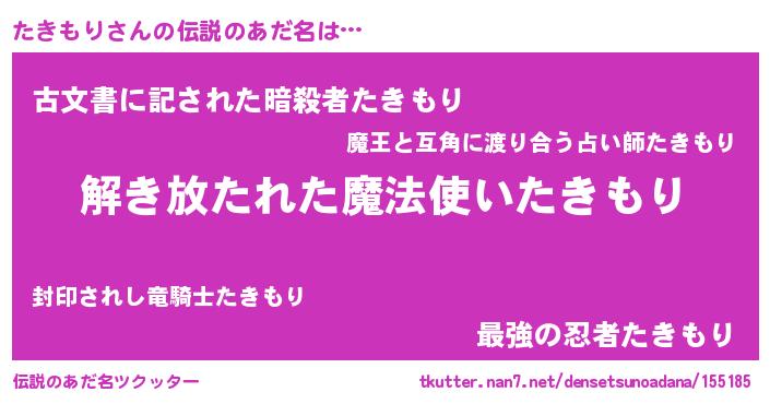 | 男性向けラノベタイトル風あだ名 | 『たきもりに滅ぼされるだけの簡単なお仕事です』 |