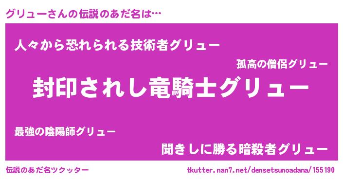 | 意味不明あだ名 | 『ペロリングリュー』『永久保存グリュー』 |