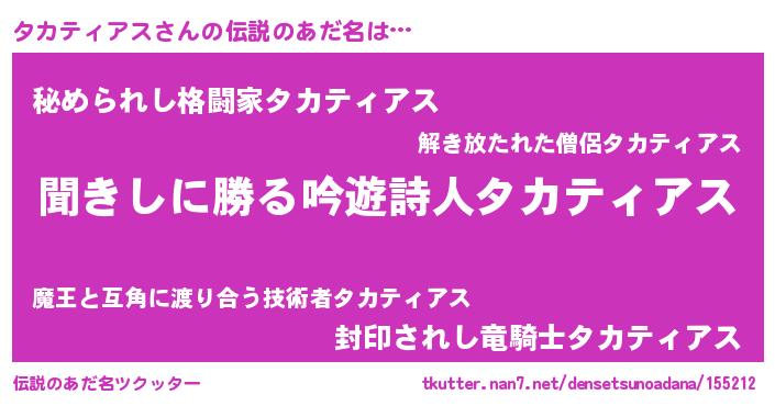 | 女子向けラノベタイトル風あだ名 | 『異世界で失敗しない100のタカティアス』 |