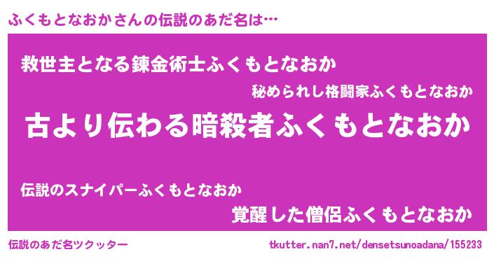 | ヒーロー風カッコイイあだ名 | 『ネオフクモトナオカ』『炎刃騎士フク』 |