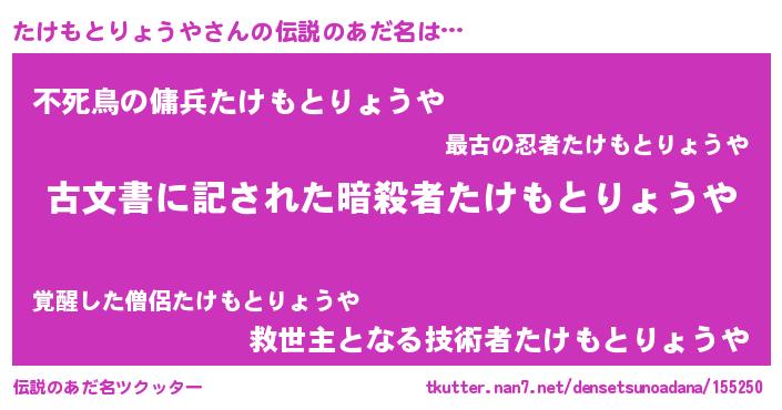 | ヒーロー風カッコイイあだ名 | 『ネオタケモトリョウヤ』『仮面タケダー』 |