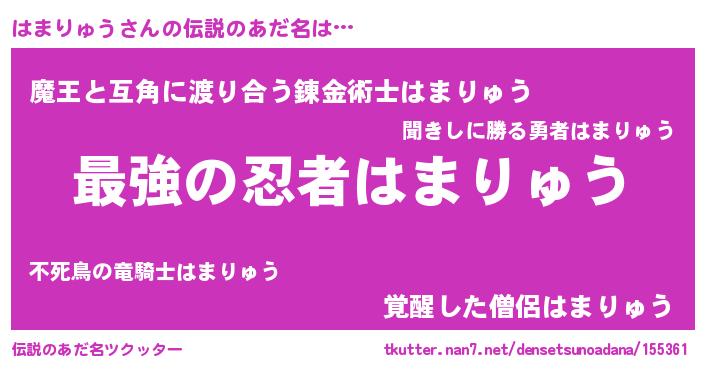 | ヒーロー風カッコイイあだ名 | 『最強戦士ハマリュウ』『仮面ハマダー』 |
