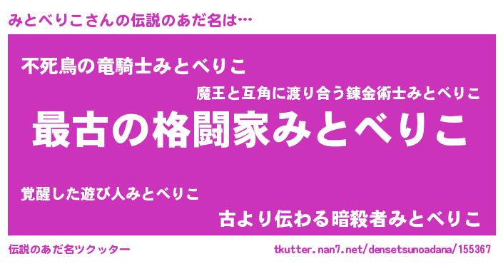 | 男性向けラノベタイトル風あだ名 | 『魔弾の王とみとべりこ』 |