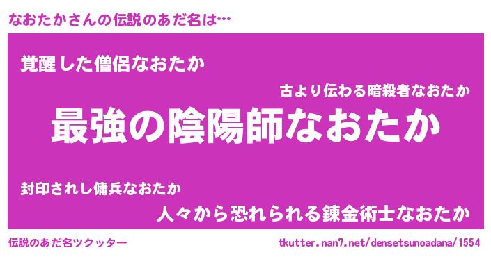 | 男性向けラノベタイトル風あだ名 | 『なおたか~年齢イコール彼女いない歴の魔法使い~』 |
