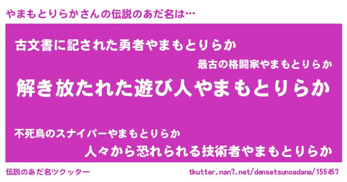 | 男性向けラノベタイトル風あだ名 | 『やまもとりらかの嫁は女の子じゃないと思った?』 |