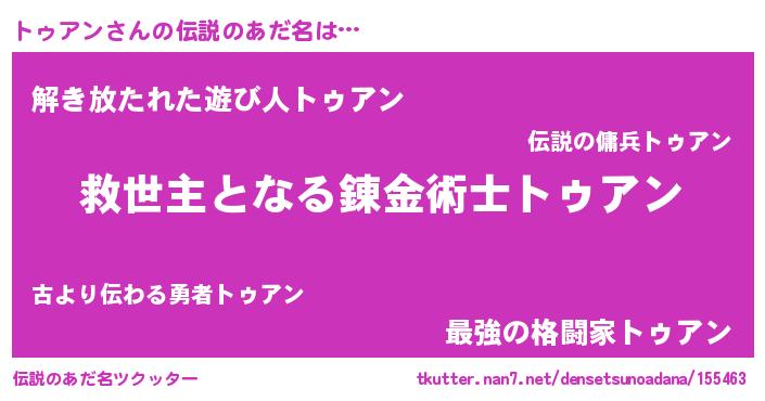 | ヒーロー風カッコイイあだ名 | 『慈愛の使者トゥアン』『幻影騎士トゥ』 |
