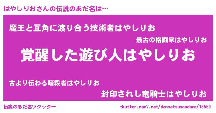 | ヒーロー風カッコイイあだ名 | 『炎刃騎士ハヤ』『慈愛の使者はやしりお』 |