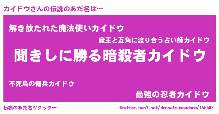 | 意味不明あだ名 | 『自称カイドウ』『永久保存カイドウ』 |
