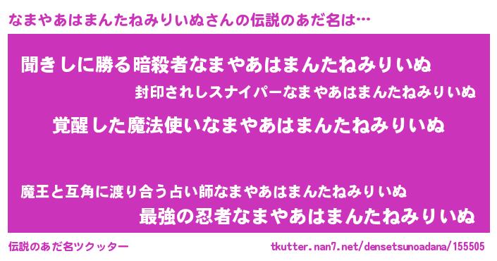 | 男性向けラノベタイトル風あだ名 | 『うちのなまやあはまんたねみりいぬが世界を掌握している!』 |