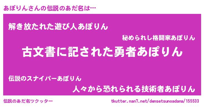 | ヒーロー風カッコイイあだ名 | 『ネオアポリン』『仮面アポダー』 |