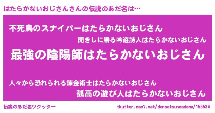 | 男性向けラノベタイトル風あだ名 | 『うちの娘の為ならば、俺はもしかしたらはたらかないおじさんも倒せるかもしれない。』 |