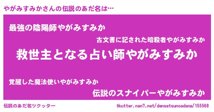 | 意味不明あだ名 | 『自称やがみすみか』 |