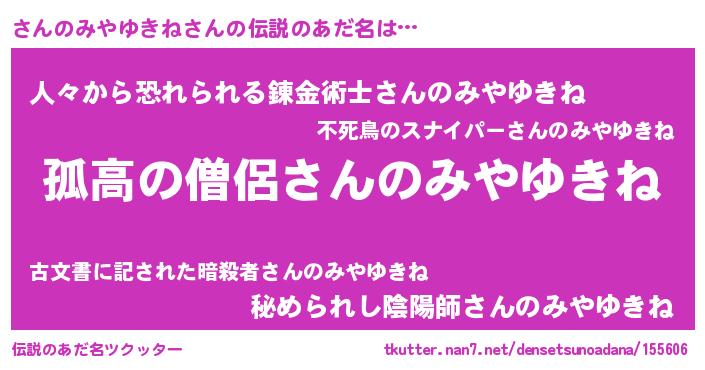 | 女子向けラノベタイトル風あだ名 | 『さんのみやゆきねは平凡を望む』 |
