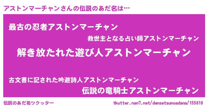 | ポケモン風あだ名 | 『ヒアストンマーチャン』『アストダネ』 |