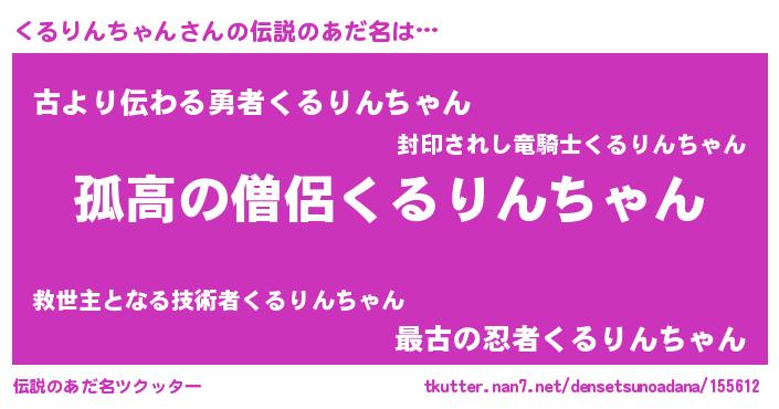 | 男性向けラノベタイトル風あだ名 | 『ダンジョンにくるりんちゃんを求めるのは間違っているだろうか』 |