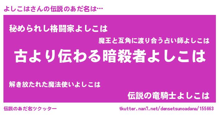 | ヘコむあだ名 | 『よしこは(爆)』『豆乳』『よしにー』 |