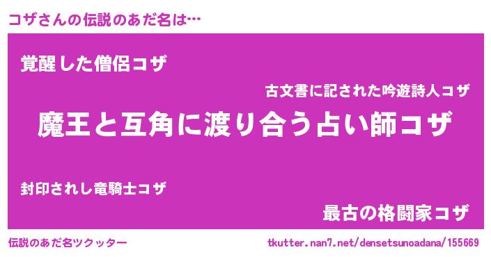 | 男性向けラノベタイトル風あだ名 | 『この素晴らしい世界にコザを!』 |