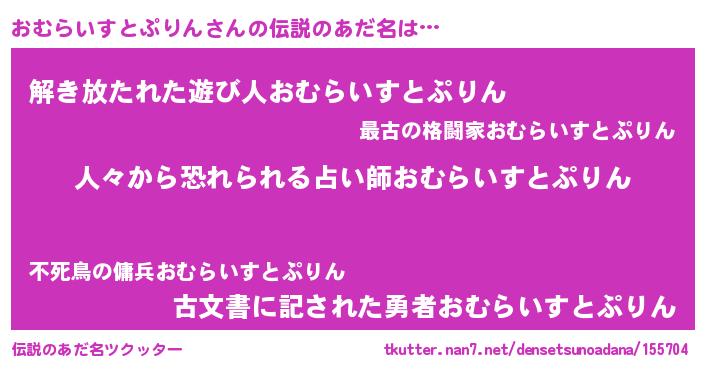 | 男性向けラノベタイトル風あだ名 | 『魔弾の王とおむらいすとぷりん』 |