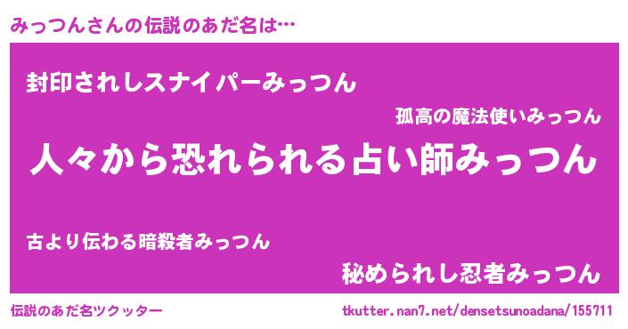 | 男性向けラノベタイトル風あだ名 | 『魔弾の王とみっつん』『みっつんの憂鬱』 |