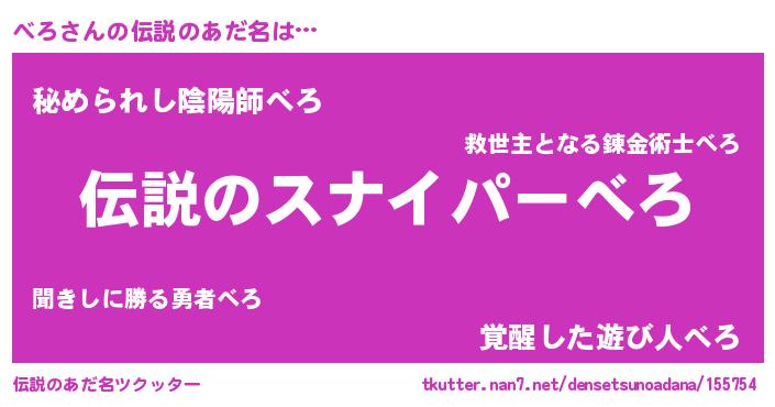 | 男性向けラノベタイトル風あだ名 | 『べろの憂鬱』『魔法科高校のべろ』 |