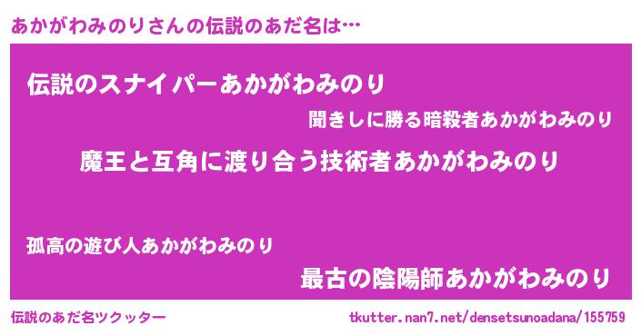 | 男性向けラノベタイトル風あだ名 | 『おまえをオタクにしてやるから、俺をあかがわみのりにしてくれ! 』 |