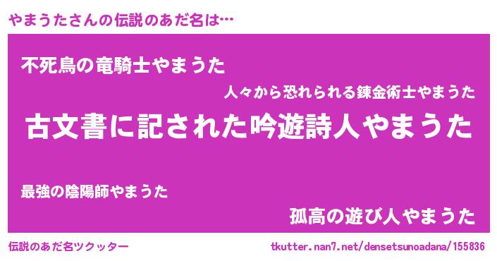 | 男性向けラノベタイトル風あだ名 | 『やまうた~年齢イコール彼女いない歴の魔法使い~』 |