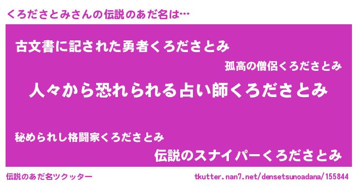 | 男性向けラノベタイトル風あだ名 | 『魔弾の王とくろださとみ』 |
