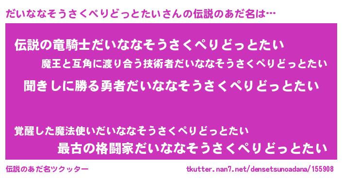 | 意味不明あだ名 | 『住所不定無職だいななそうさくぺりどっとたい(81歳)』 |