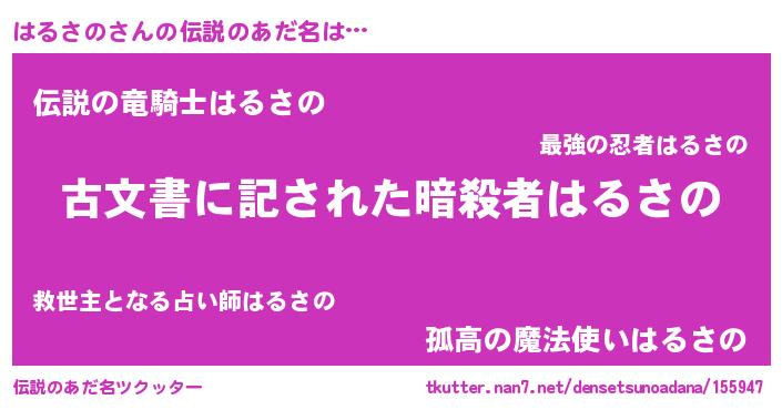 | 意味不明あだ名 | 『自称はるさの』『永久保存はるさの』 |