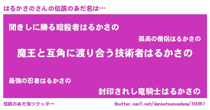| 意味不明あだ名 | 『自称はるかさの』『永久保存はるかさの』 |