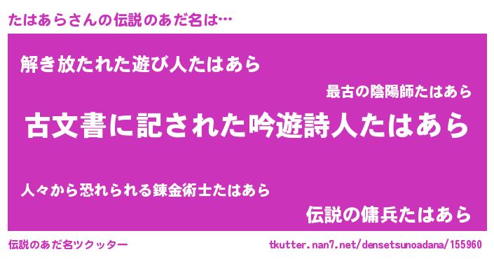 | 意味不明あだ名 | 『永久保存たはあら』『自称たはあら』 |