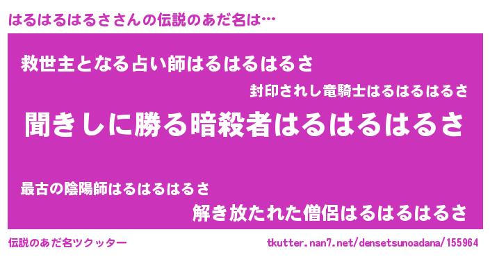 | 女子向けラノベタイトル風あだ名 | 『異世界で失敗しない100のはるはるはるさ』 |